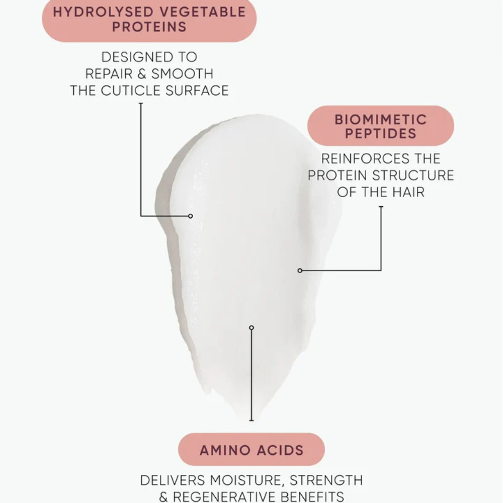 Gracias a su combinación de péptidos biomiméticos, proteínas vegetales hidrolizadas y aminoácidos esenciales, esta mascarilla sella la cutícula, suaviza medios y puntas y proporciona un acabado sedoso con alto brillo sin apelmazar.